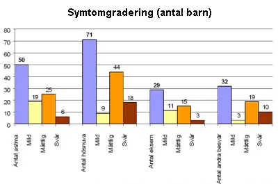 • 49 av barnen hade astma, 71 hösnuva, 29 eksem och 32 andra besvär (fig.3 nedan)