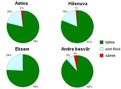 • Upp till 88 % av barnen fick minskade allergibesvär. Av dem som hade astmasymtom blev 79% förbättrade, med hösnuva 81 %, med eksem 76% och med andra besvär 88% (fig. 5 nedan).