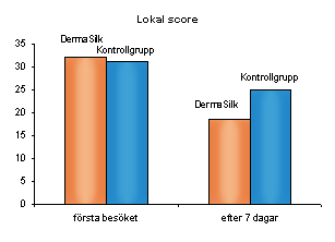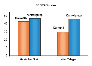 Varje barns sjukdomsbild bedömdes med SCORAD-index. Detta följdes av en jämförelse mellan lokal ”score” för de huddelar som var täckta med DermaSilk och de huddelar som inte var täckta.