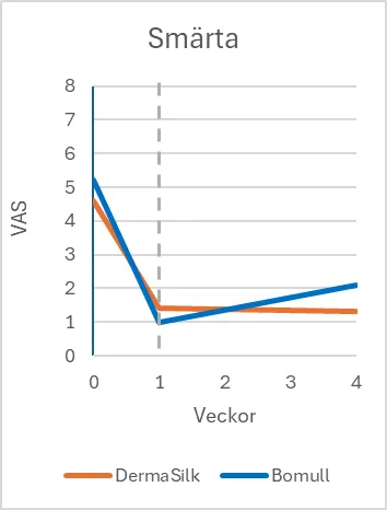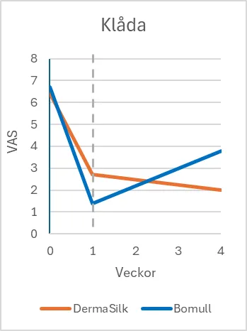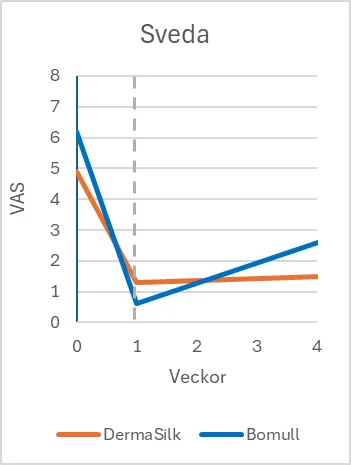 • Förlängt intervall utan symptom. Det längsta tidsintervallet utan symtom: 22,5 dagar i DermaSilk-gruppen mot 7,2 dagar i bomullsgruppen.